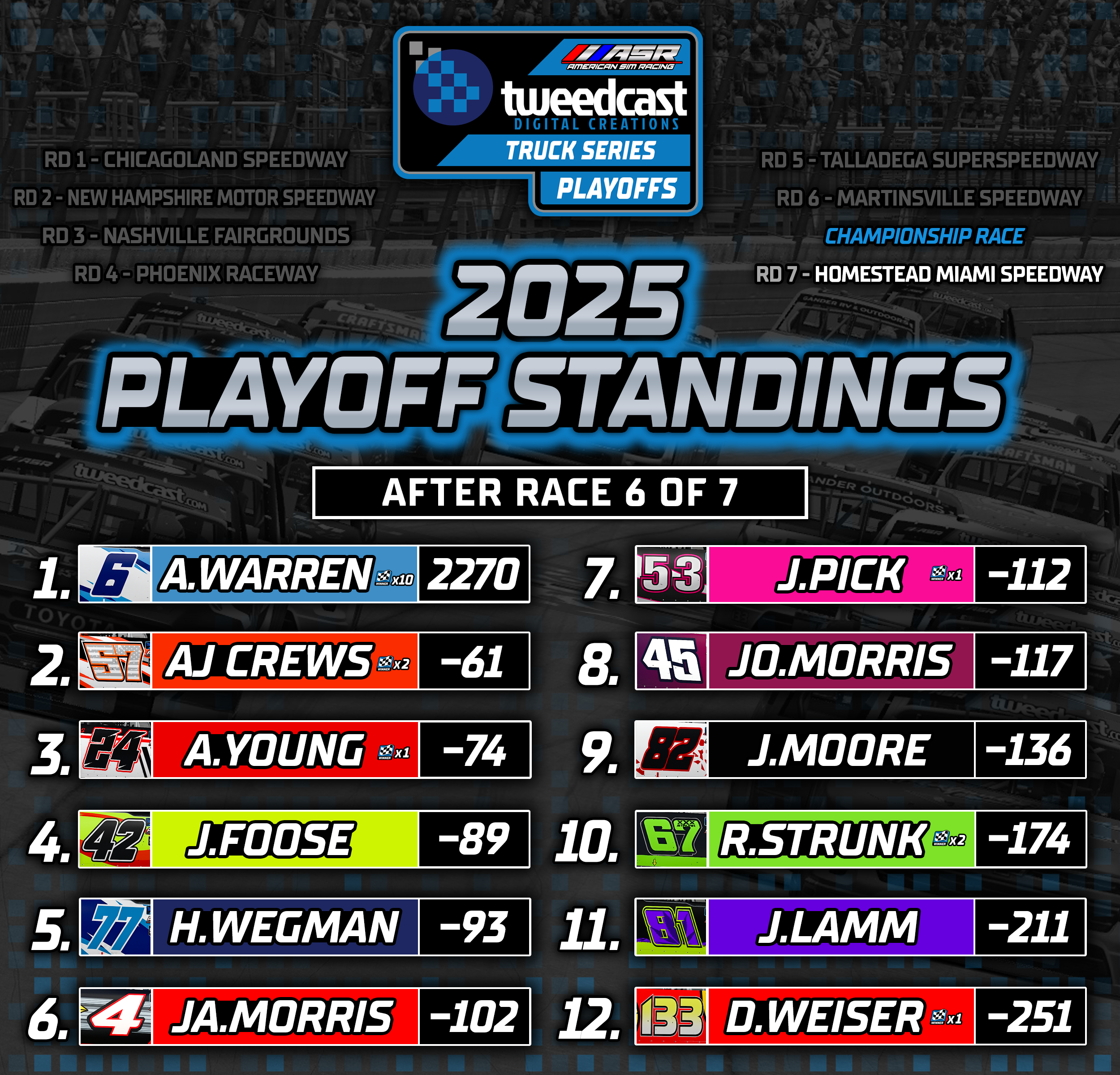 -With another podium at Martinsville, Andy Warren has officially clinched the 2025 Tweedcast Digital Creations Truck Series Championship, securing his third consecutive title.