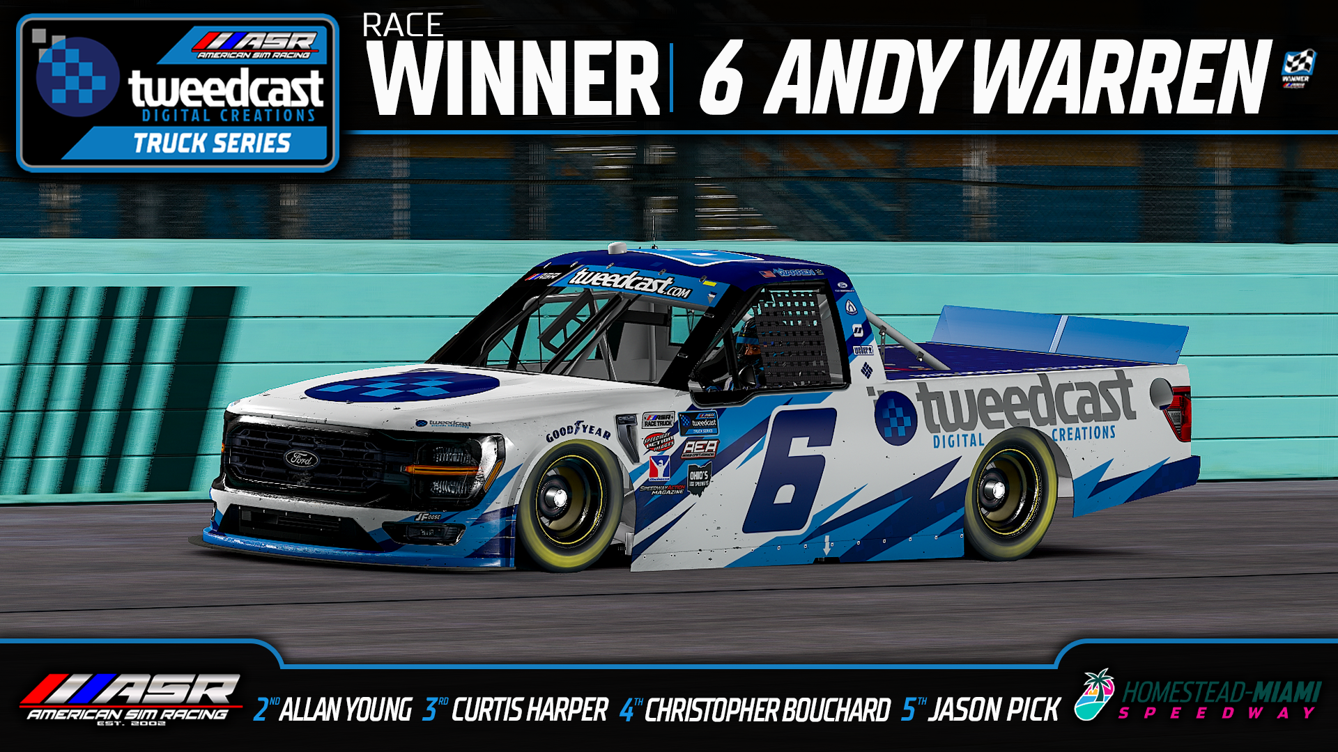 Warren won the 2025 Tweedcast Digital Creations Truck Series Championship by 73 points, his third consecutive championship. AJ Crews finished second -73 points, Allan Young 4th -81, and Harley Wegman and Jim Foose tied for fourth in the standings, -106, with the tie-breaker going to Wegman, who scored more top five finishes in 2025.