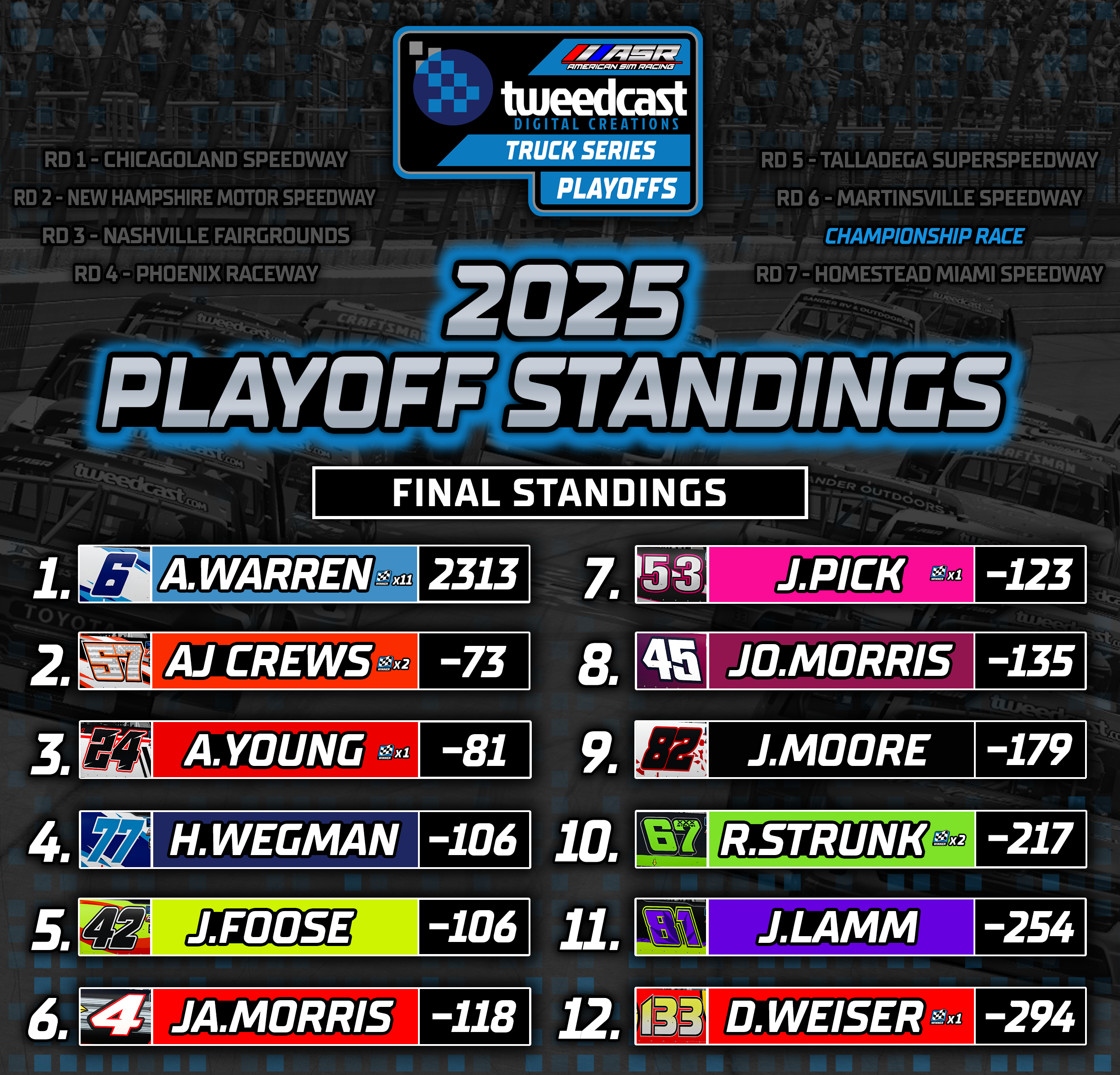 The 2025 Tweedcast Digital Creations Truck Series season came to a close under the lights at Homestead-Miami Speedway. The finale featured 84 laps, five different leaders, and a single caution, bringing an end to one of the most competitive playoff runs in series history.