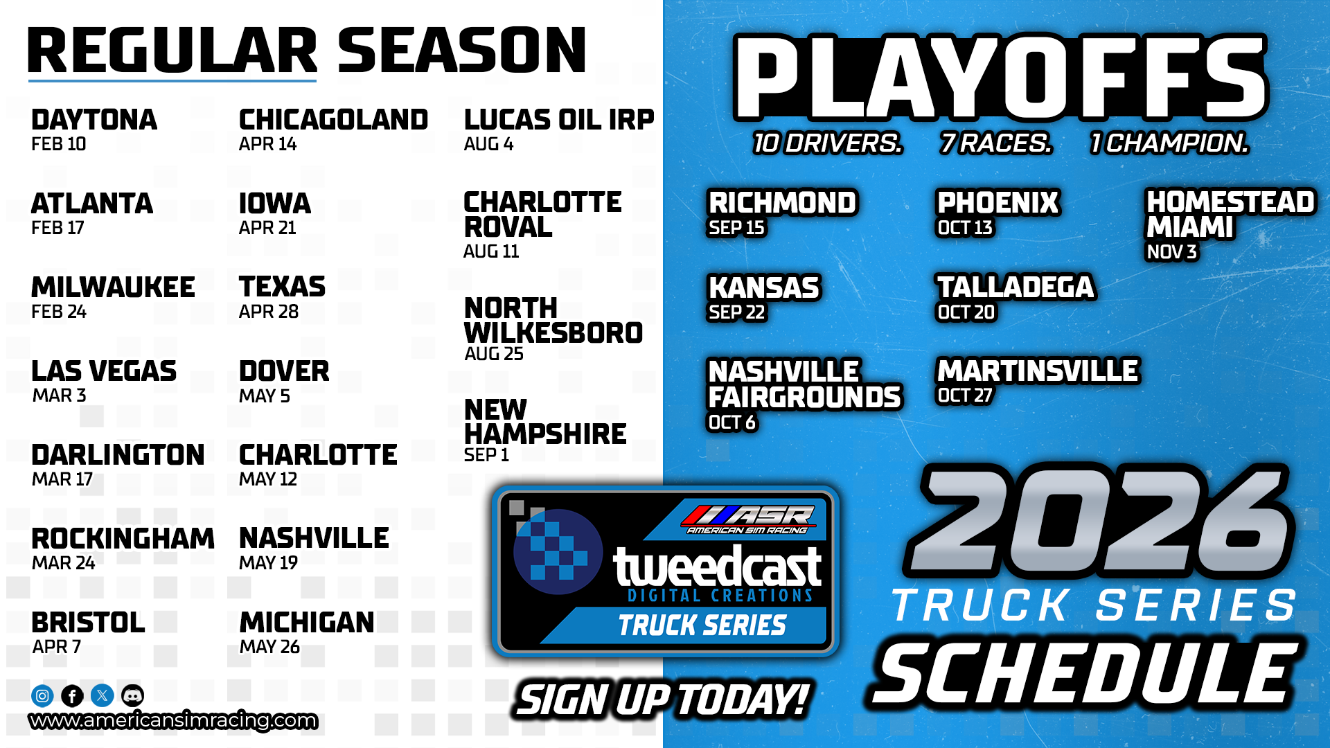 The 2026 ASR Tweedcast Truck Series Schedule looks similar to years past with many former tracks returning to action with just one new addition.